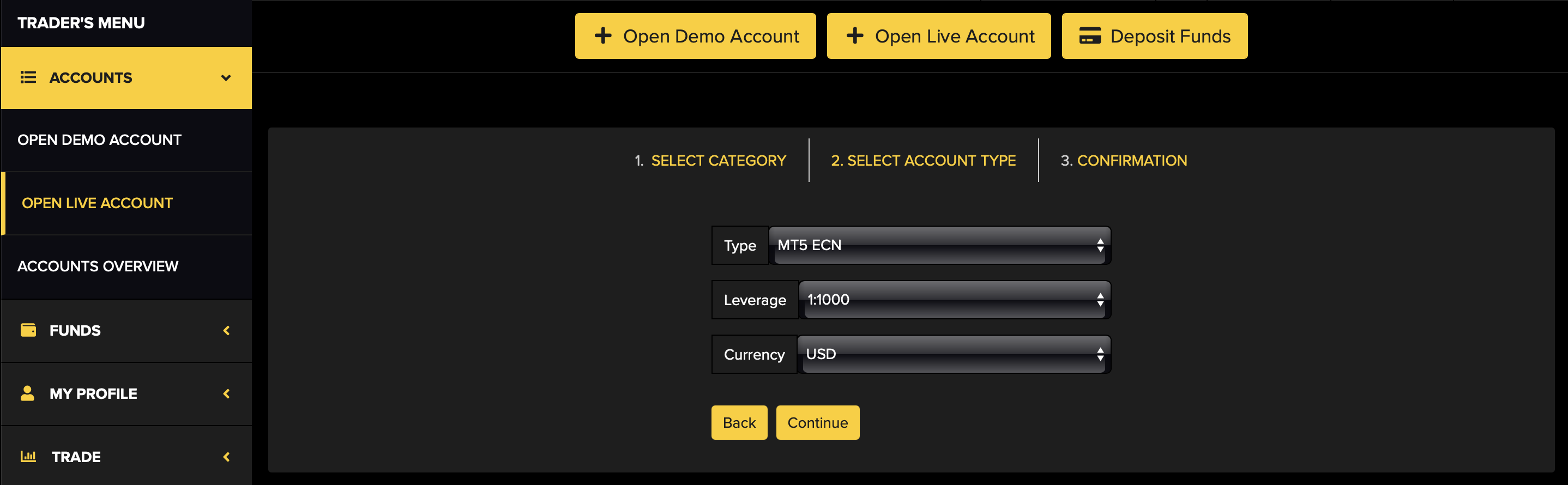 You can easily create a Live Trading Account anytime from your Trader’s Menu.